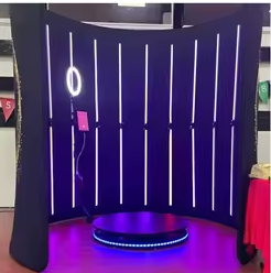 Guests step onto a sleek raised platform surrounded by infinity lights. A high-speed camera mounted on a rotating arm swings smoothly around them, capturing cinematic slow-motion from every angle.