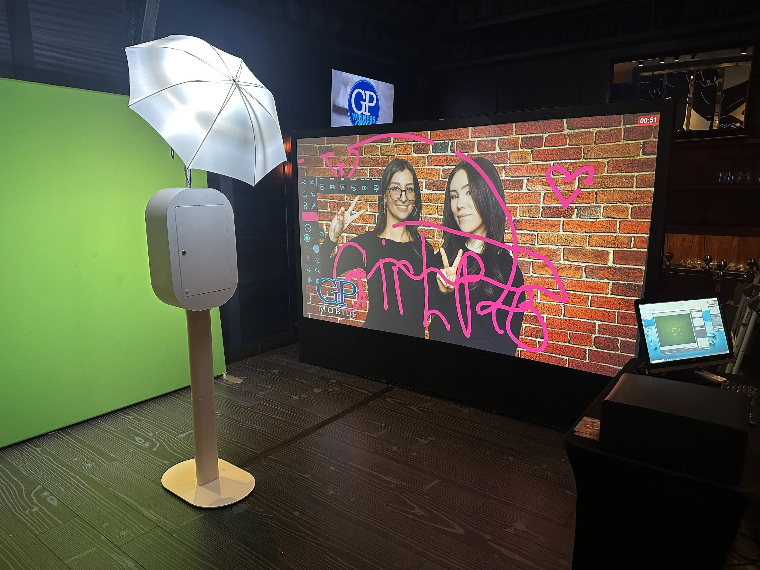 Our Graffiti Booth is a portable, interactive digital canvas that lets guests create bold artwork by “spray painting” on a massive screen using proprietary digital spray cans — no mess, no limits, all creativity.