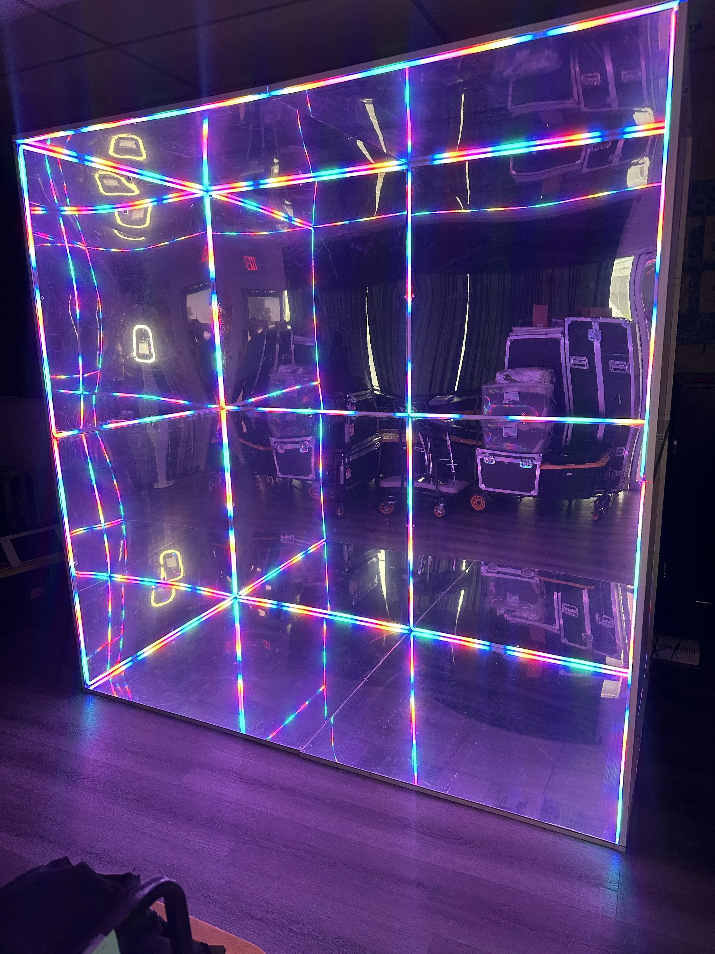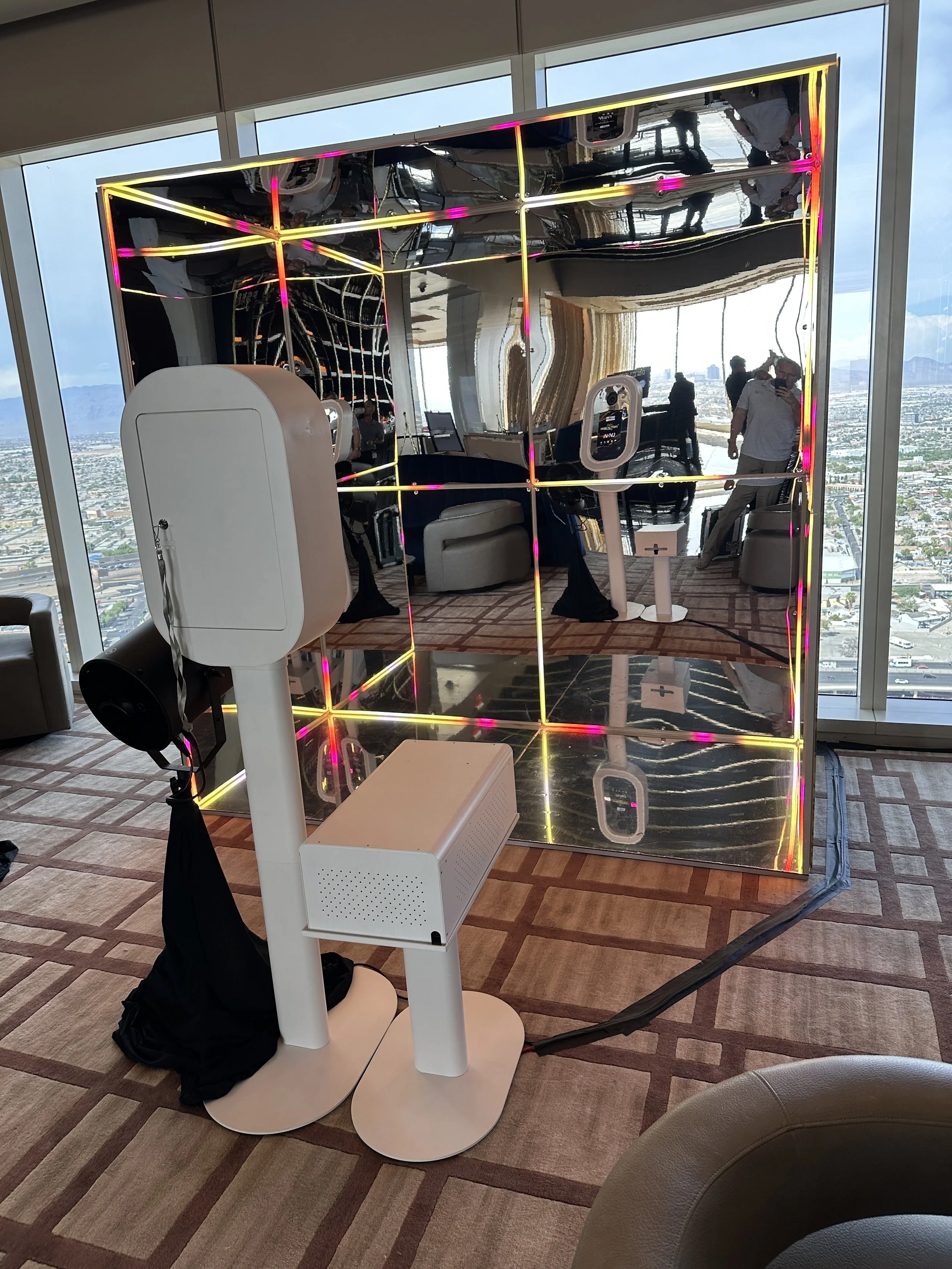 The LED Mirror Enclosure is an immersive mirrored space surrounded by color-changing LED lighting that transforms every photo and video into a bold, high-impact experience.